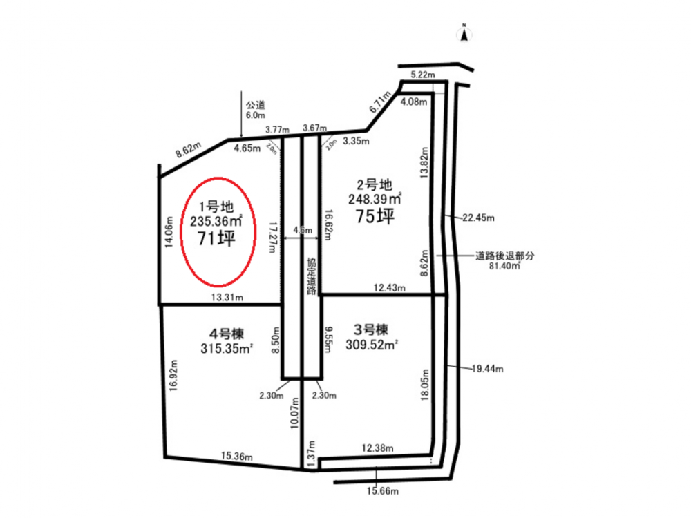 1号地: 土地面積235.36㎡(うち協定道路部分3.88㎡は共有地)。