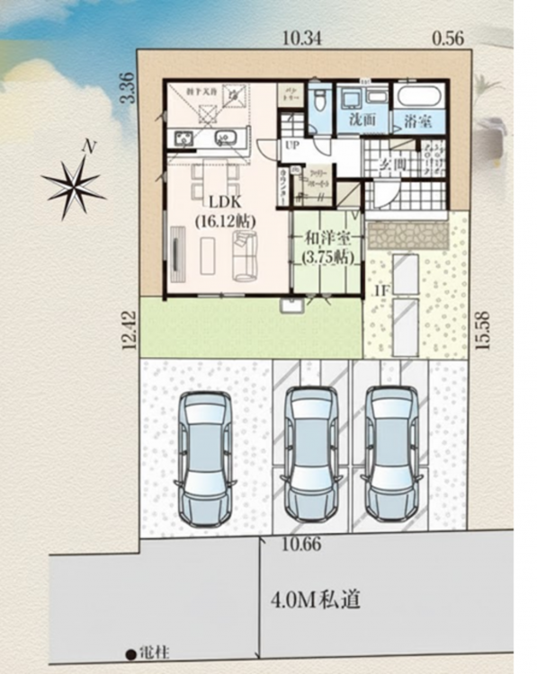 - 南側 私道4m 間口約10.6m 42条2項道路