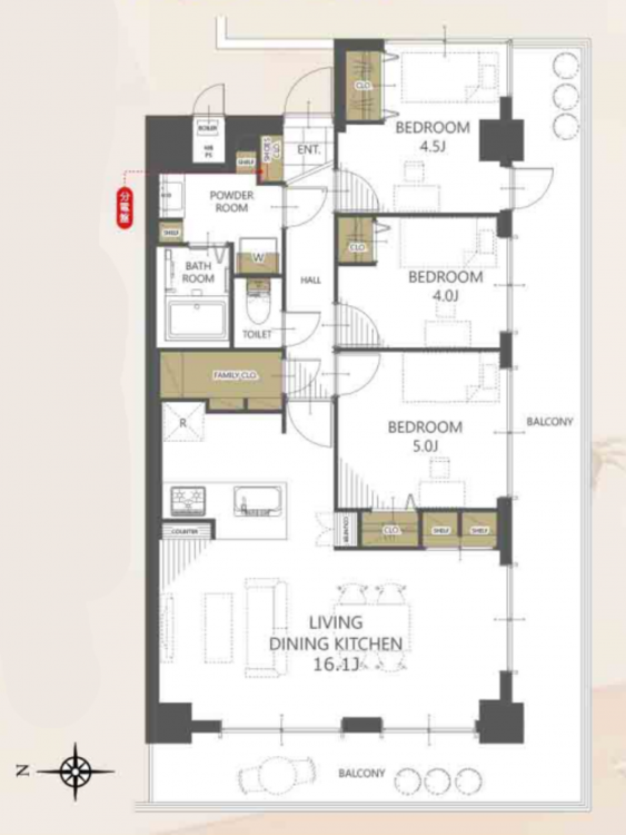 - システムキッチン、カウンターキッチン、食器洗浄乾燥機、シャンプードレッサー、洗浄便座、オートロック、ペット可、エレベーター、ファミリークロークあり、駐輪場・バイク置き場あり